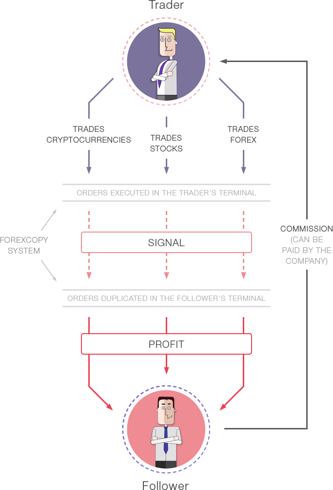 • عندما يفتح المتداول الصفقات ويغلقها، يتم نسخ هذه المعاملات في حساب المتابع وفقا للمعايير المحددة، مما يجلب للمتابع مبلغا معنيا من الربح. ورسوم الاشتراك تعتمد على الطريقة المختارة. يتم خصمها إما من حساب المتابع أو أموال الشركة.