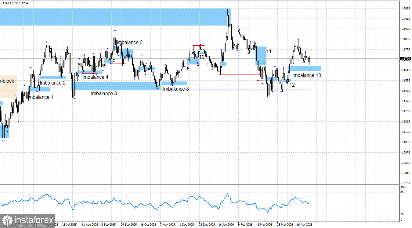Пара EUR/USD продолжает находиться в рамках слабого коррекционного отката. За минувшие 24 часа графическая картина евровалюты не изменилась абсолютно, несмотря на обильный информационный поток. Однако, я думаю, никто не удивился тому, что минимум 90% от общего количества новостей и событий были вновь проигнорированы. Это отлично видно по активности трейдеров – в среду и четверг она практически не отличалась от предыдущих дней. До «бычьего» имбаланса 13 остается пройти совсем немного, но на данный момент этот паттерн не отработан, а «бычий» сигнал не образован. Я предполагал, что спрогнозировать события на этой неделе будет непосильной задачей, но сам рынок эту задачу упростил до максимума – движений не было практически никаких. Даже на дневном графике хорошо видно, что в последние шесть дней цена находится примерно в одной и той же зоне, и не может продвинуться ни вверх, ни вниз. Таким образом, можно долго анализировать итоги заседания ФРС или ЕЦБ, выступления Джерома Пауэлла или Кристин Лагард, инфляцию в Евросоюзе, ВВП в Европе и США. Однако рынок продолжает игнорировать, ждать и молчать. Таким образом, я считаю, что сейчас по-прежнему следует ожидать образования сигнала в имбалансе 13. Другого торгового плана попросту нет.