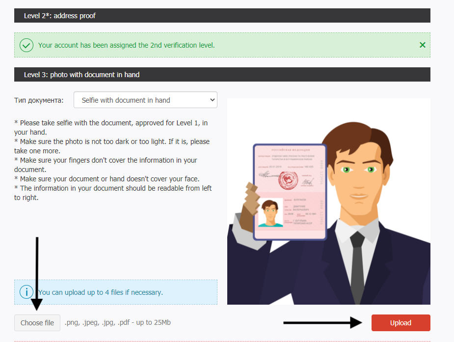 After you pass two levels of verification, the field for uploading documents to the third verification level will appear in the Verification section of the Client Area.