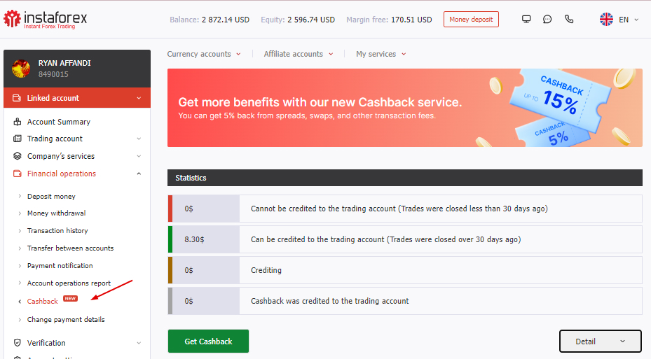 โปรแกรมคืนเงินทำงานดังนี้: คุณเพียงแค่ทำการซื้อขายตามปกติและปิดธุรกรรมตามเครื่องมือที่เลือก ในท้ายที่สุดของวันการค้า ธุรกรรมที่ปิดจะปรากฏในห้องทำงานของลูกค้า (KK) การเปลี่ยนแปลงที่เกี่ยวข้องกับการได้รับเงินคืนสามารถติดตามได้ที่ KK/การดำเนินการทางการเงิน/คืนเงิน ในส่วนนี้ จะแสดงการทำธุรกรรมทั้งหมดในแต่ละวัน พร้อมด้วยฟังก์ชั่นค้นหาตามเครื่องมือและหมายเลขคำสั่งซื้อ รวมถึงการเลือกช่วงเวลาการแสดงธุรกรรมและสถานะที่เกี่ยวข้อง