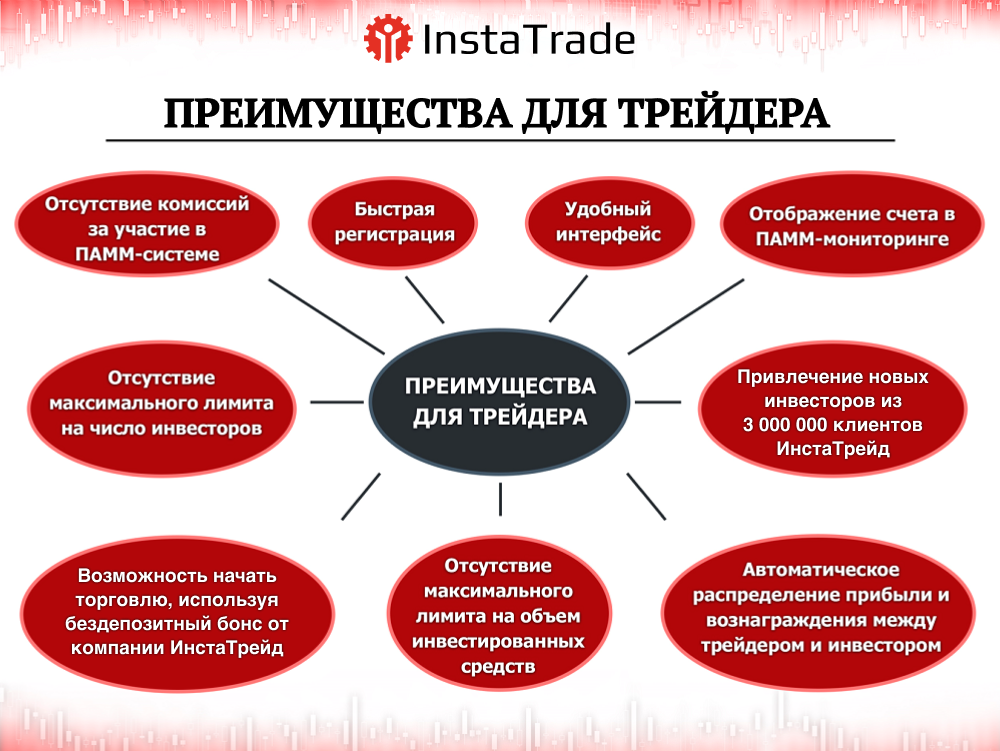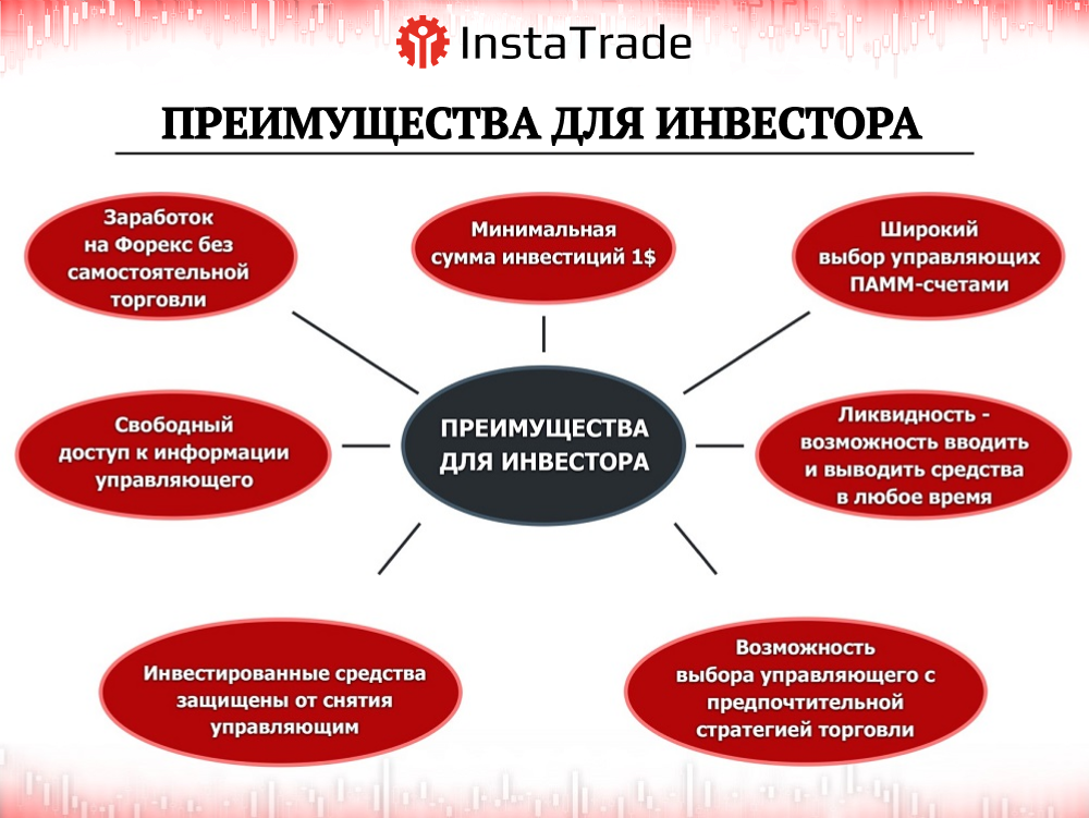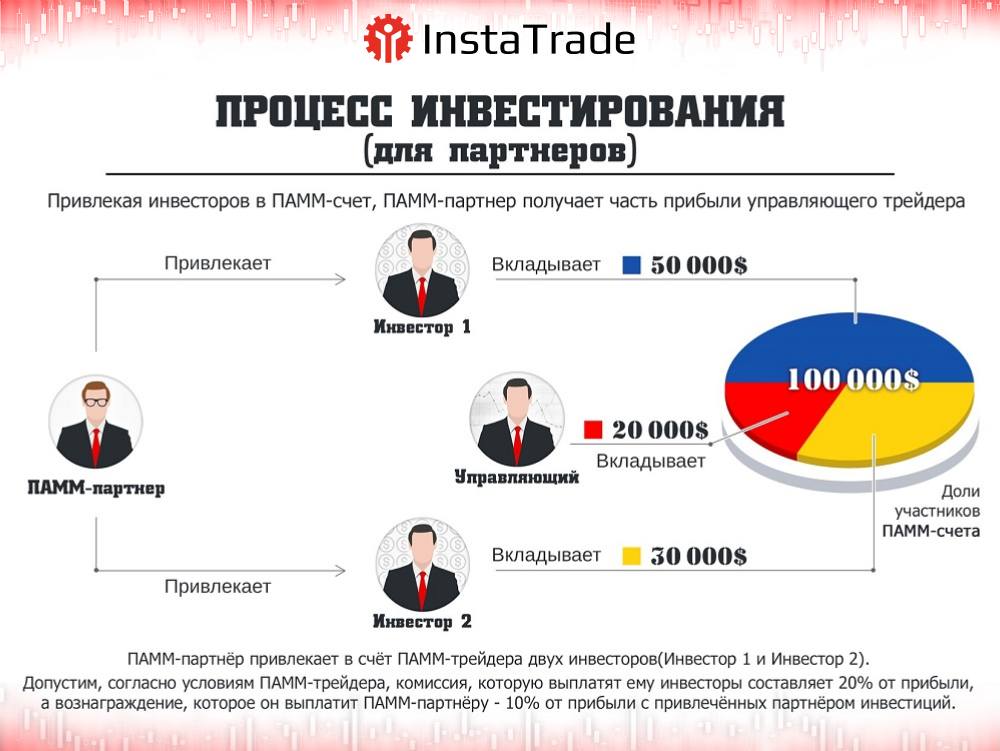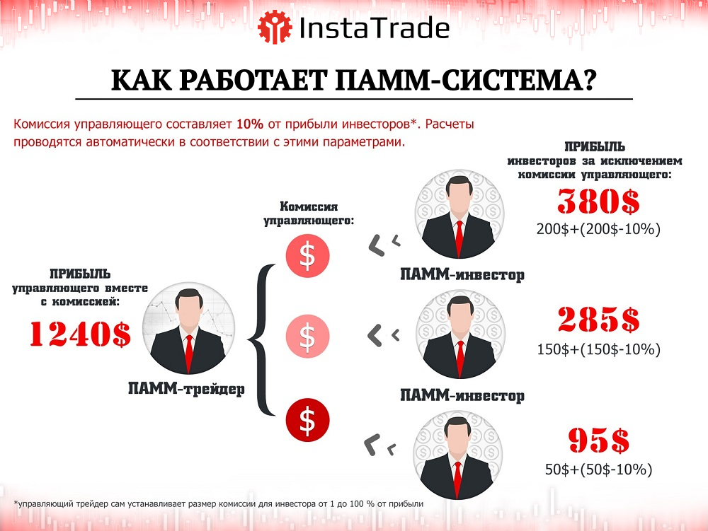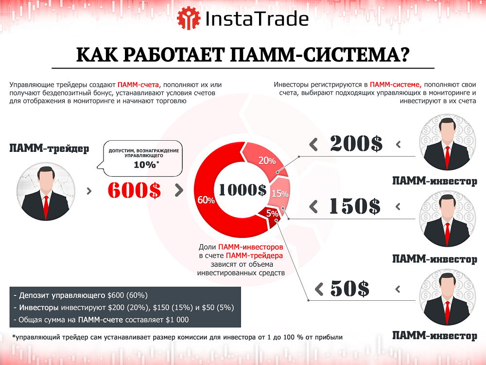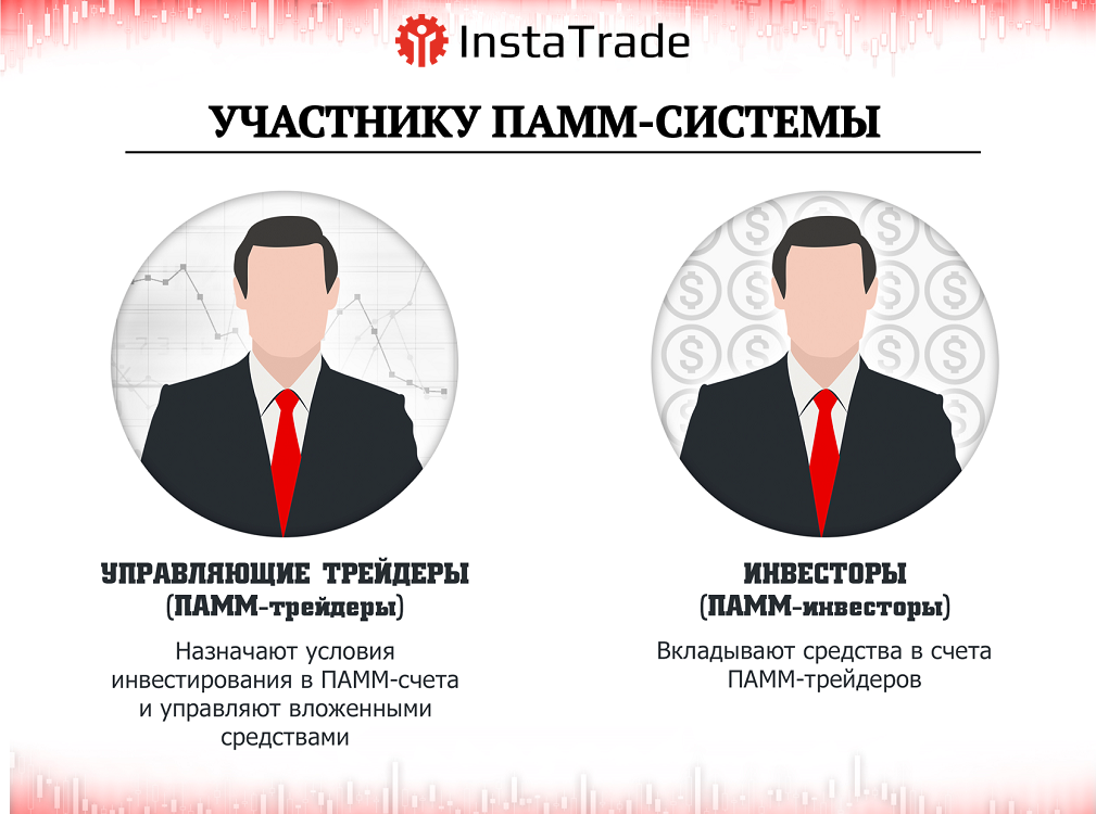 | 3 | Mijoz kabinetida PAMM-tizimi uchun anketani to'ldirgandan so'ng Siz PAMM-tizimning to'laqonli ishtirokchisi bo'lasiz. O'z savdo hisob-varag'ingiz uchun PAMM-tizimida qanday rolini (Treyderni yoki Investorni) tanlab olganingizga bog'liq hoda Siz yo investitsiyalarni qabul qilishingiz, yoki boshqa treyderlarga investitsiya kiritishingiz kerak bo'ladi, ular bosh saytda monitoring sahifasida yoki mijoz kabinetida PAMM-treyderlar monitoringi bo'limida aks etadi. |